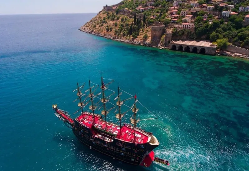 As the ship sets sail along the turquoise Mediterranean coast, you’ll enjoy stunning panoramic views of the coastline. The lively pirate-themed crew will entertain you with authentic shows, interactive games, and exciting activities for all ages. Children will love the treasure hunts, face painting, and playful water fights, creating lasting memories of fun and adventure.