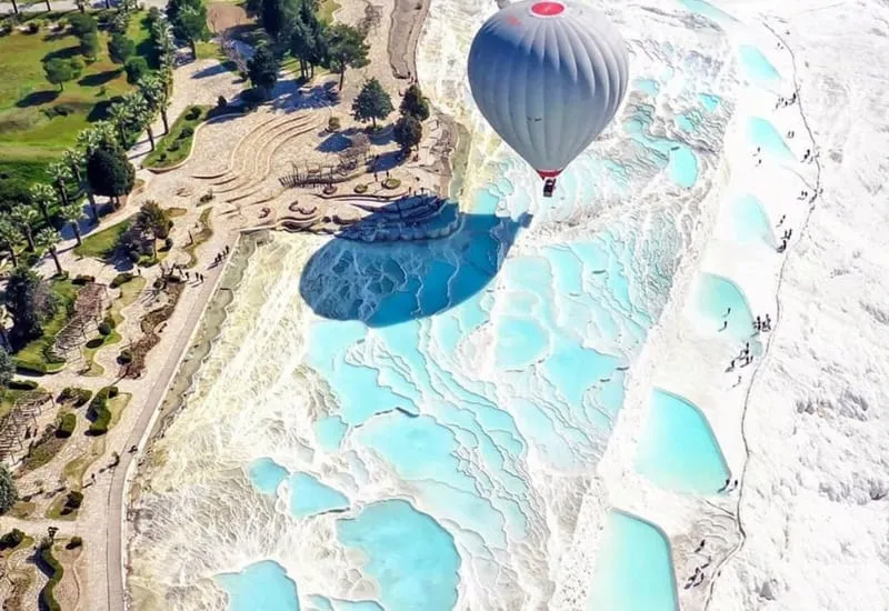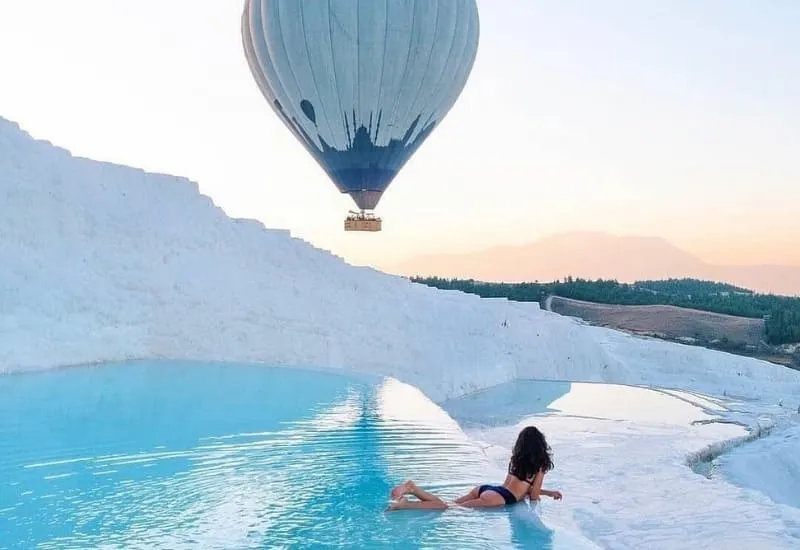 Fly over Pamukkale at sunrise or enjoy the view from below. Includes breakfast, lunch, and full-day guided Pamukkale tour in Turkey.