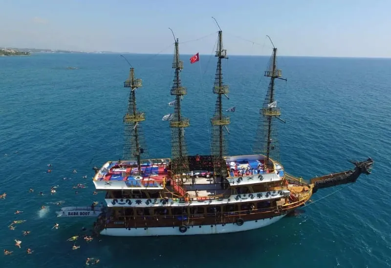 After a short transfer to the harbor, you'll board a spacious, wooden-style double-deck boat designed for comfort and fun. As you leave the harbor behind, you'll cruise along the breathtaking coastline of Side, with the sun shining above and the sea breeze refreshing your spirit. The boat makes several stops at crystal-clear bays and coves, giving you plenty of time to swim, snorkel, or just float peacefully in the calm waters.
